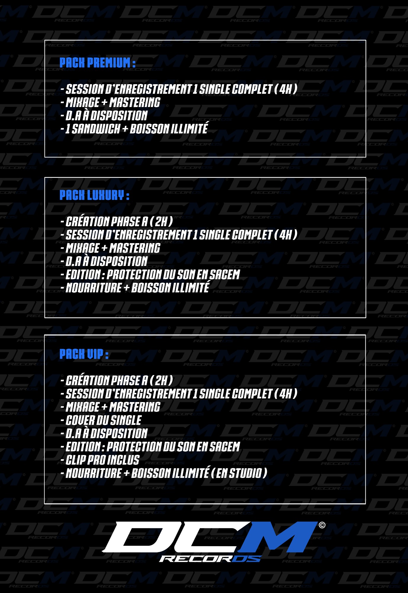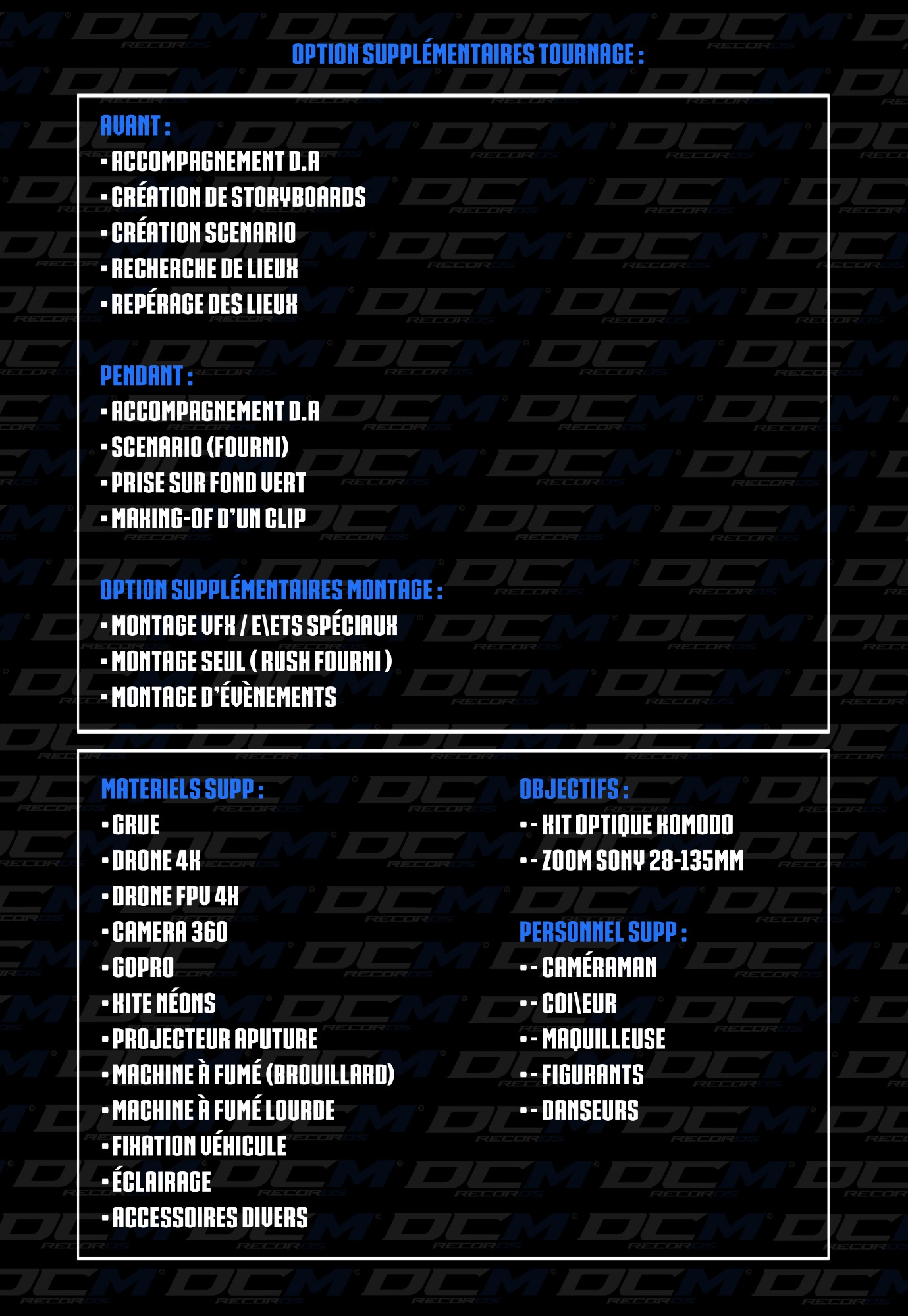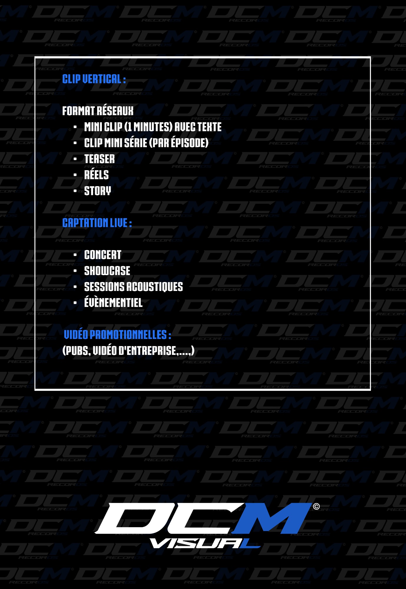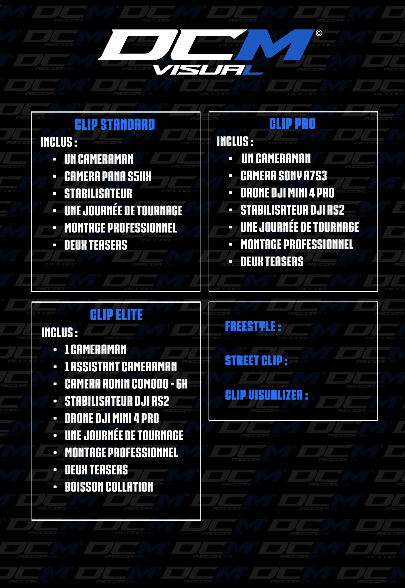 Vous trouverez ici toutes nos cartes concernant nos prestations en studio, les clips et autres prestations visuel, mais aussi ce qui concerne la photographie, le graphisme et le design. Pour tous renseigments n'hésitez pas à nous contacter.